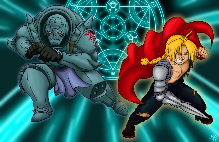 Original art printed for sale at Anime Expo 2019 in Los Angeles. Image features Edward and Alphone Elric from FullMetal Alchemist before a transmutation circle. Drawn in Adobe Photoshop. Distributed…