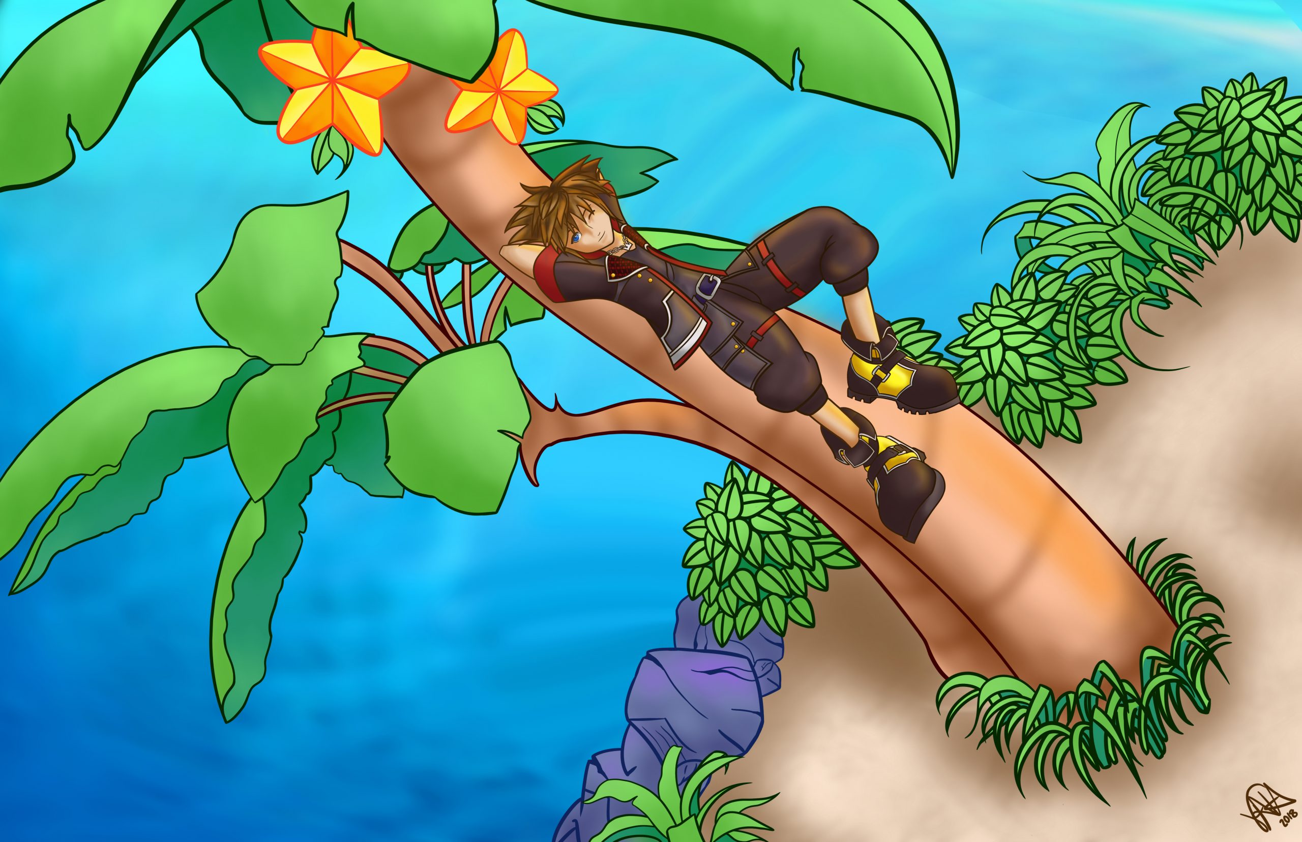 Original art printed for sale at Anime Expo 2019 in Los Angeles. Image features Sora from Kingdom Hearts reclining on a paopu tree. Drawn in Adobe Photoshop. Distributed in three…