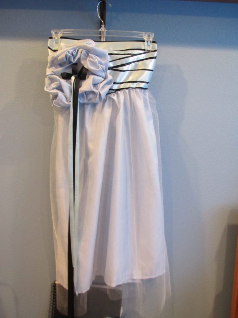 The skirt of the dress is made with one layer of satin and one layer of tulle. Extra satin was used to make the bow. The bodice is made from 60 yards of ribbon that were sewn together to create the proper pattern. Another 6 yards of ribbon were used to sew the shoes over insoles.
